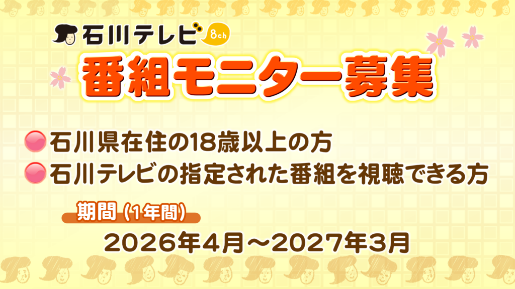 石川テレビでは、視聴者の声を番組の向上に役立てるため、番組モニターを下記の要領で募集いたします。