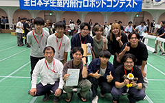 日本航空宇宙学会が主催し、被災地への救援物資輸送などを想定したミッションを競う「全日本学生室内飛行ロボットコンテスト」で、KIT金沢工業大学ロボティクス学科 伊藤研究室の学生たちがマルチコプター部門で初の1位に輝きました。主要メンバーの一人として6つのプロペラを搭載する機体の設計を担当した4年の西本拓未さん。3年計画で優勝をと仲間と取り組んできましたが2年で実現!嬉しさはもちろんですが、大学院進学も決め、来年は全自動化と早くも次を見ています。 |